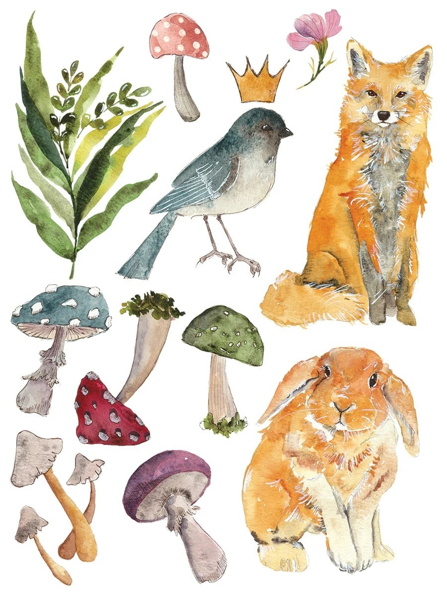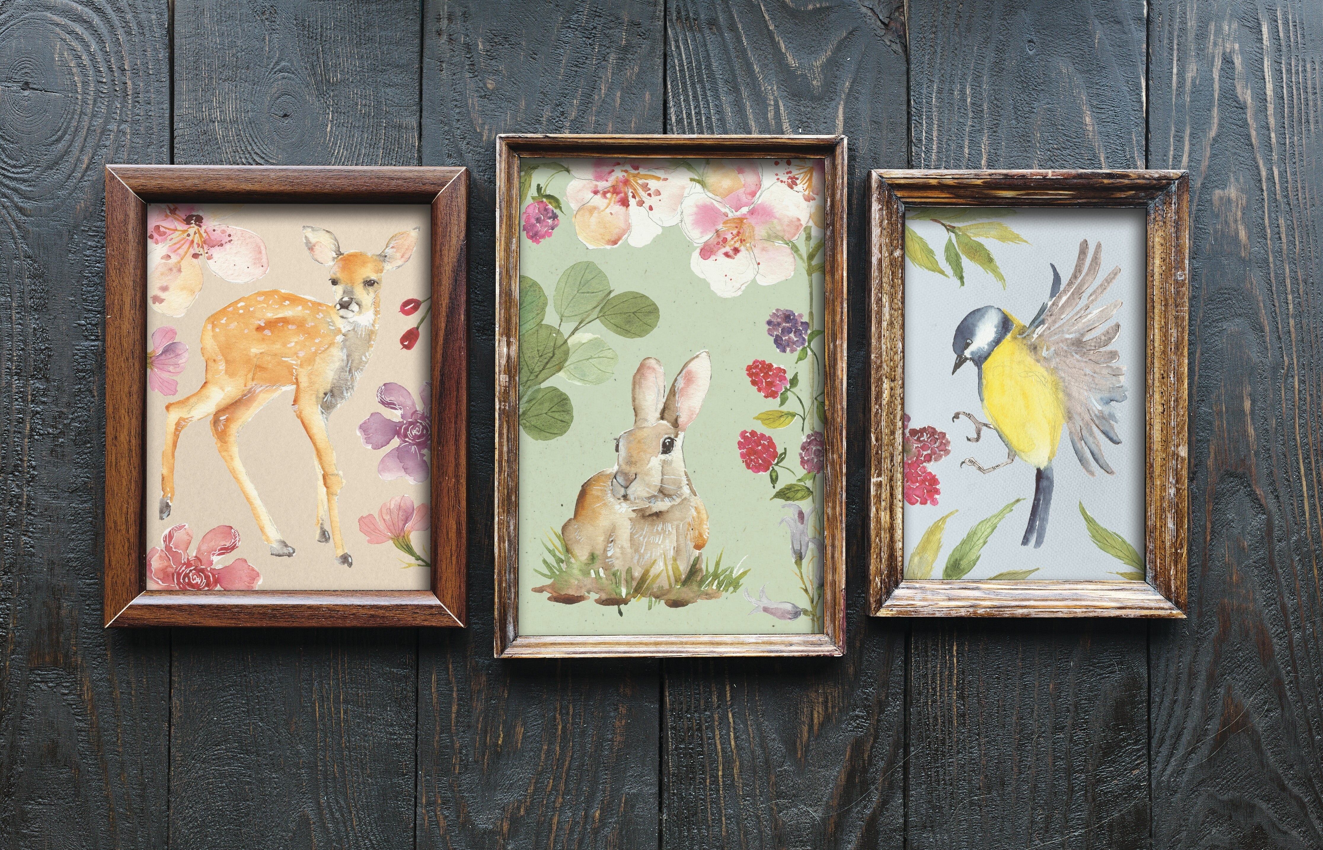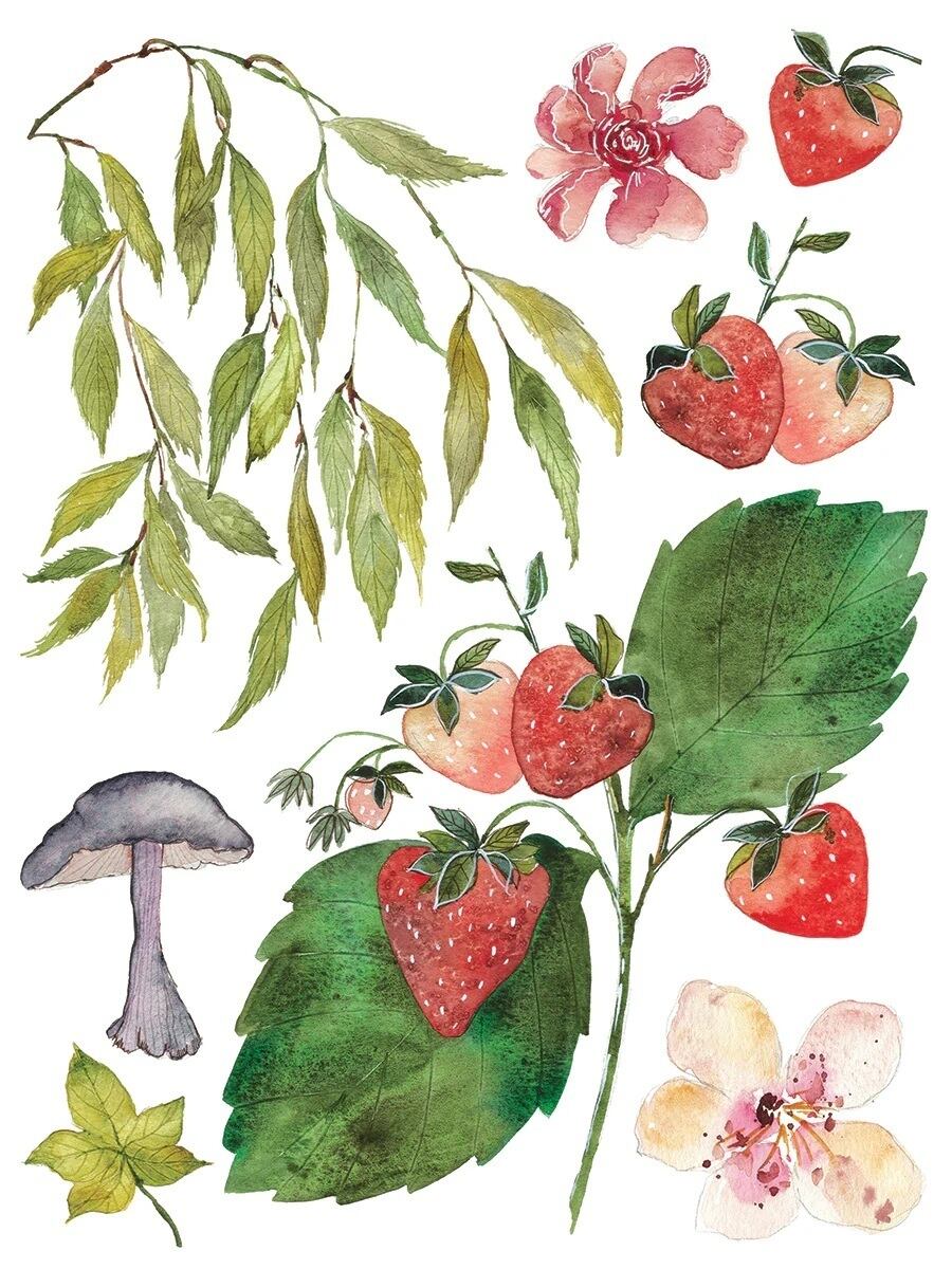 植物や花、動物たちがやわらかな筆致で描かれ、物語性のある情景を生み出します。